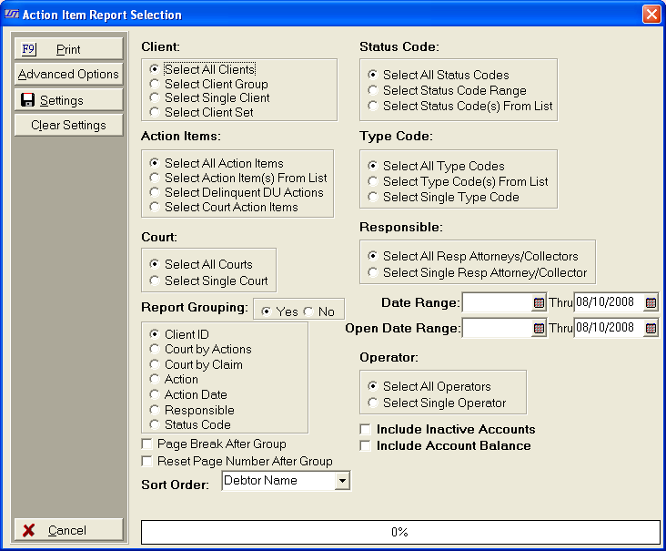 report by either Debtor Name, Client Id, Action Date and Time or Court