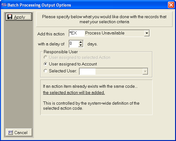 The Add Action Item batch process will allow you to add this action item to a group of debtors accounts. Use the selection criteria to narrow the group of debtors. Otherwise, all debtors for all clients will be selected by the batch process.