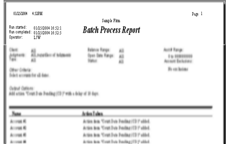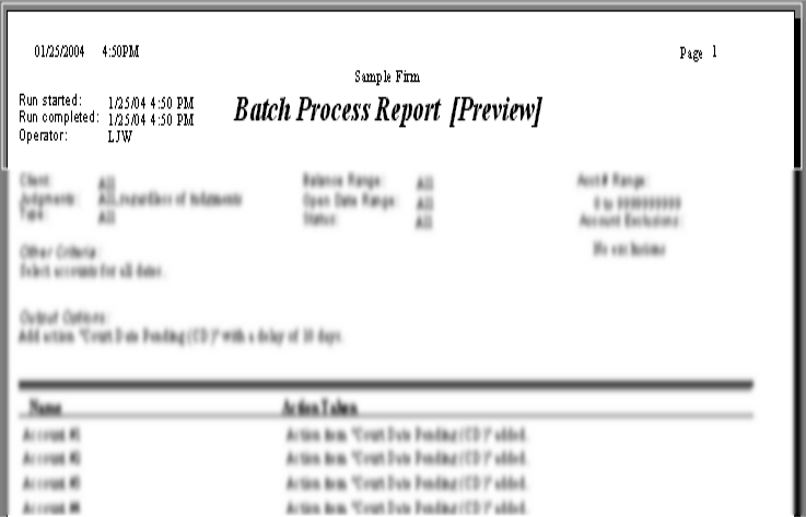 A preview report will print listing the accounts that have been selected for the batch and the action to be taken on these accounts.