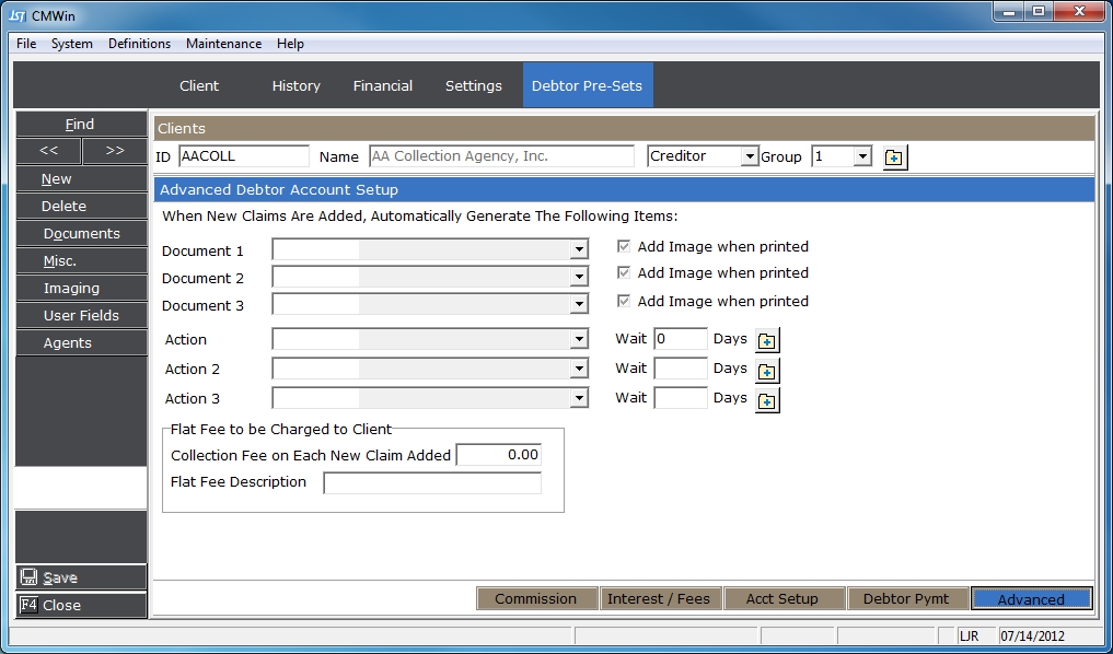 CollectMax allows you to set up to 3 documents to be put on the print list when an account/claim is added for this client.