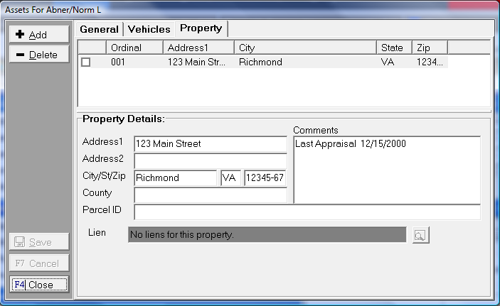 If a Lien has been added for this property, it would be listed in the Lien section. To view the attached lien, click the button. For information on attaching a Lien to this property, see How to Enter Lien Information. Any modifications to the asset screen will be recorded in a history of change note on the History Tab.