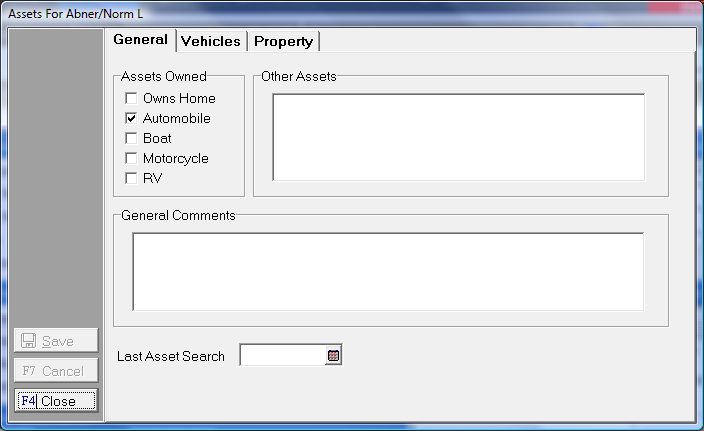 On the General tab of the Assets Screen, enter general information about the debtor's assets or other assets other than Property and Vehicle.