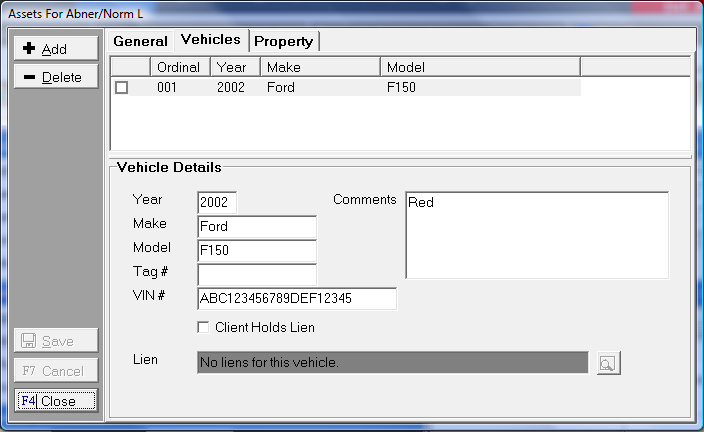 CollectMax allows you to track the Debtor's Assets including property and vehicles owned. Property and Vehicle assets may be attached to liens entered in the Litigation area of CollectMax.