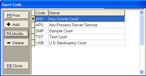 From the menu bar of CollectMax, select Definitions, Codes, Court/Payee