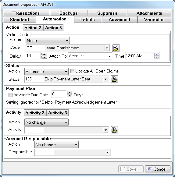 Allows you to add up to three actions, change the status code, advance payment plans, add activity codes and change responsible codes when the document is printed or sent to the Print List. Client Level Documents are not eligible for Automation.