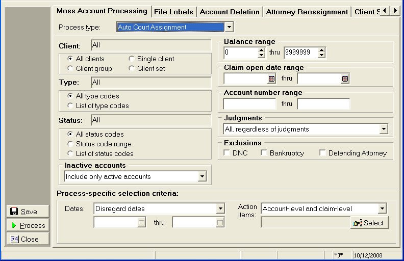 Hint: If you only want open accounts for your batch process, select a status range from the beginning open status to the last open status.