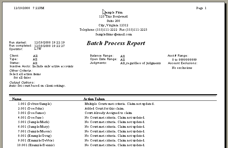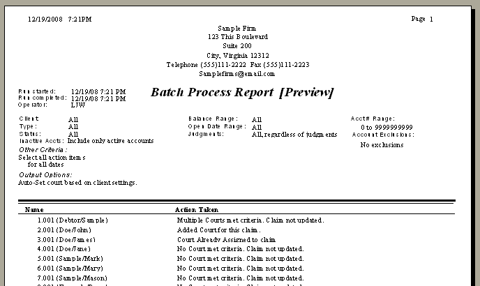 A preview report will print listing the accounts that have been selected for the batch and the action to be taken on these accounts.