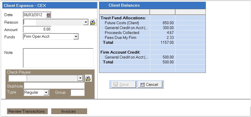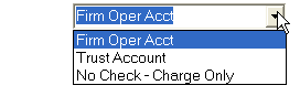 Did your firm spend money from the Firm Operating Account to pay for expense? If so, select Firm Oper Acct from the Funds field. If no check was generated for expense, and you simply want to charge your client for the expense, select No Check - Charge Only from the Funds field.