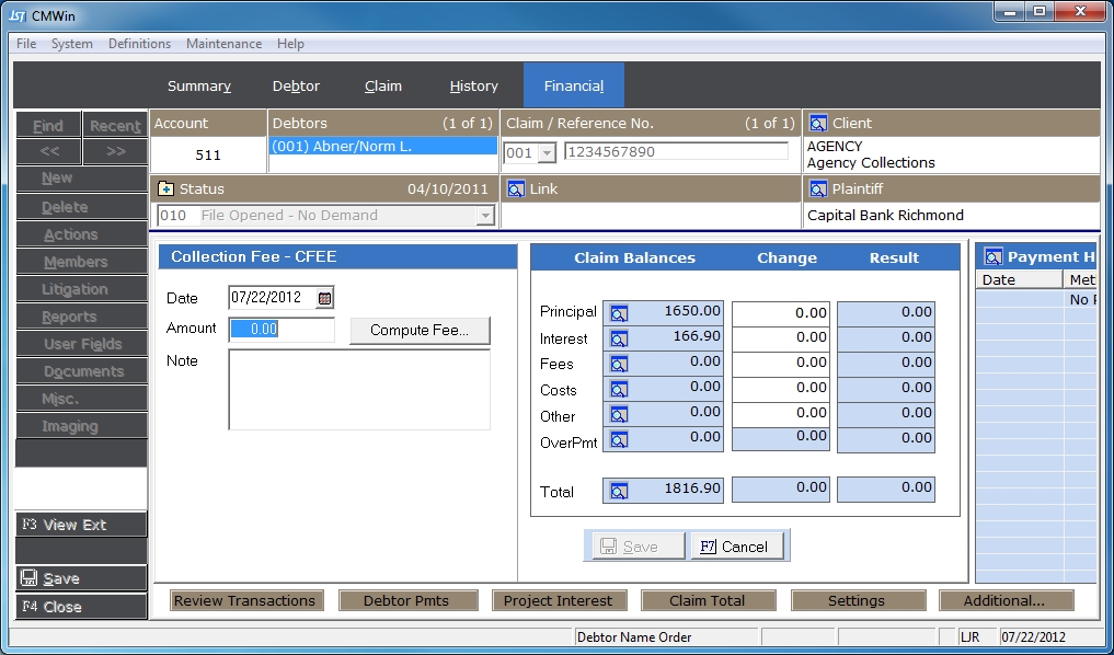 If using the Compute Fee option, CollectMax will maintain the settings used to compute the fee for any subsequent CFEE transactions. CollectMax will continue to maintain these settings until different settings are used in the Compute Fee option.