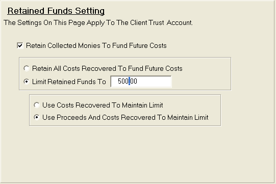 Note: If the box is grayed out, this option is not allowed on this account. The client has to be setup with type 2 or 3 accounting arrangements allowing claim level cost funds. To set the retainage for type 1 accounting, see Retainage.