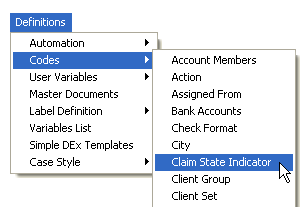 select Codes and Claim State Indicator to bring up the Claim State Indicator Definition Screen.