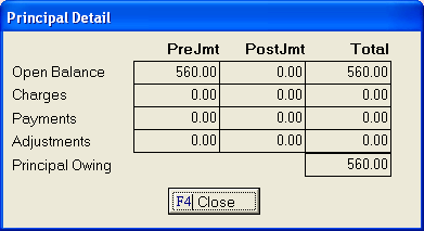 The Detail Screen will list a breakdown balance of each Claim Balance component at time of open, any charges payments and adjustment to bring it to the current balance.