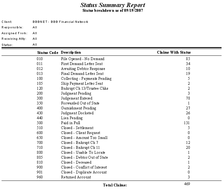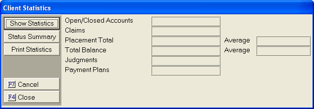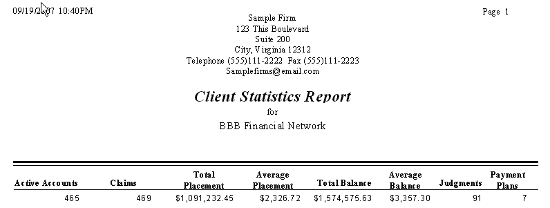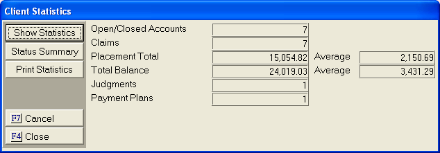 CollectMax will allow users to get some basic client level statistics from the client accounts including number of active accounts and claims, the total balance placed, the current total balance, and number of judgments and payment plans.