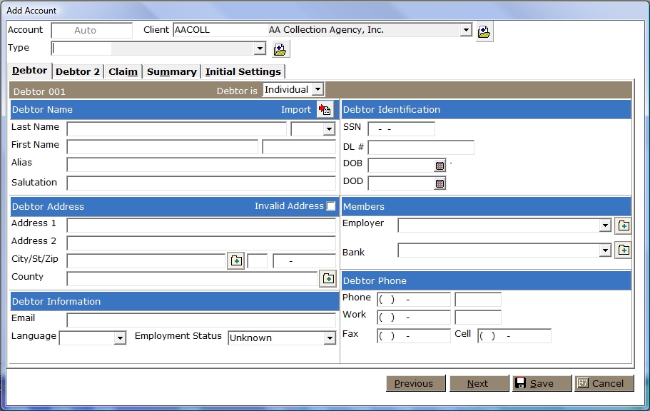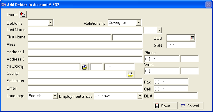 From the Debtor Tab of the Add Account Screen or the Add Debtor to Account Screen,