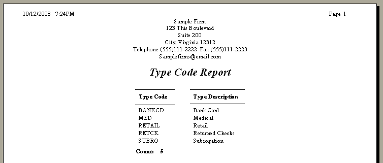 Type codes are general purpose claim account descriptors for the type of debt owed. The codes may be up to six letters and digits.