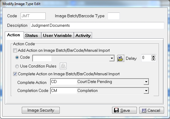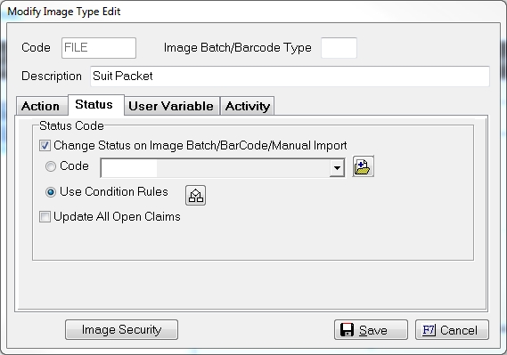 Select the Image Type code to add the action and/or status change conditions and click a