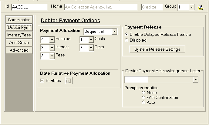 Enter the Payment Allocation order, either Sequential or Prorated. This will be the order in which the debtors payments will be applied at the time the payment is posted.