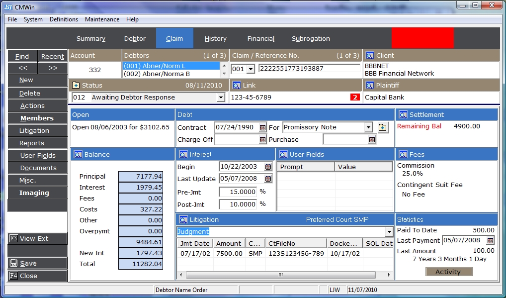 The Debtor Claim Tab provides an accounting of the current claim balance, rates, commission and a summary of the litigation screen.