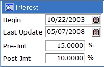 The Interest section lists the Begin Interest Date, the Last Interest Update Date, the Pre-Jmt Interest Rate and the Post Jmt Interest Rate. The Begin Interest date is the date the claim began earning interest. You should be careful when editing this date to avoid miscalculated interest. The Last Interest Update is the last date that CollectMax update the Interest Balance with new interest accrued. You should be careful when editing this date to avoid miscalculated interest. The Pre-Jmt Interest Rate is the rate at which the claim accrued interest prior to a Judgment being posted on the claim. The Post-Jmt Interest Rate is the rate at which the claim accrued interest after a judgment was posted to the claim. To