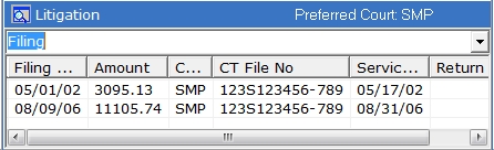 The Litigation section lists the Preferred Court Code and select Filing or Judgment Information. If the claim has judgment(s) attached the screen will default to pull up the Judgment Information. Otherwise, the Filing Information will be displayed. To switch to view either the Filing or Judgment Information, click the button. To view the Litigation Screen, click the