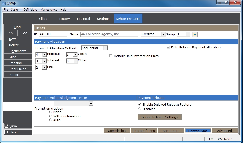 CollectMax allows you to setup some account defaults such as Payment Allocation, Payment Release Dates and Acknowledgement Letters. Payment Allocations allow you to set the order in which payments pay the account balance components such as principal, interest, fees, costs and other. These settings will default these fields to the selected data when adding a new account or claim. These can be overridden by the data entry person after the account has been added.
