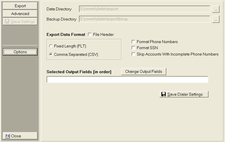 Each dialer program requires certain information to be included in the export file. Please check with the provider to see what fields they require and in what order these fields should be listed in the file.