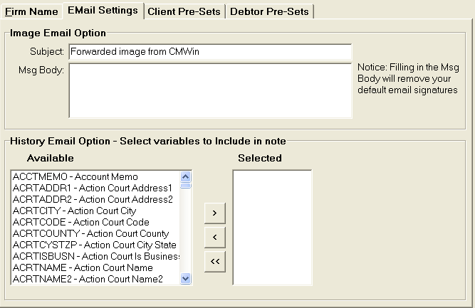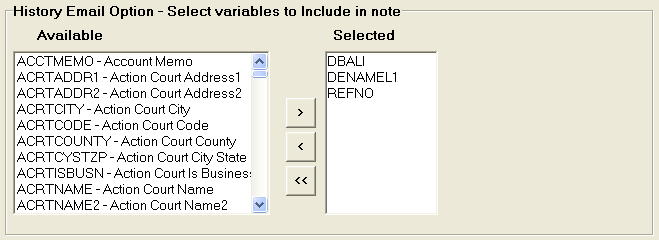 The option allows users to select variables to be included on Email to Client Feature. See New Debtor History Note for more information on the Email to Client Feature.