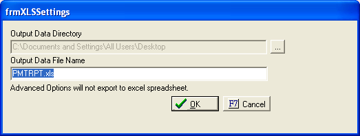 The Excel File name will be PMTRPT.xls. To change the XLS file name, enter the name in to the Output Data File Name Field.