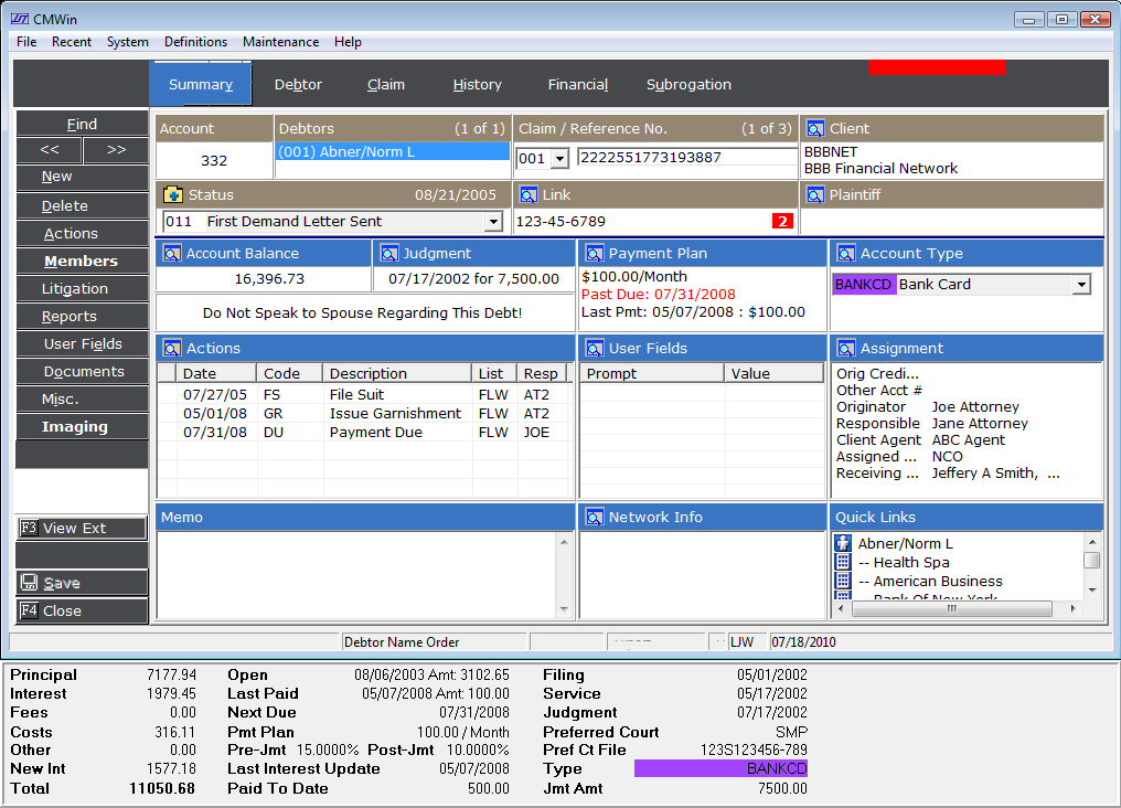 The Extended Account View screen will appear at the bottom of the screen to display the claim information. The extended Account View screen will continue to be displayed between tabs, claims and accounts until you close the screen or exit debtor accounts.