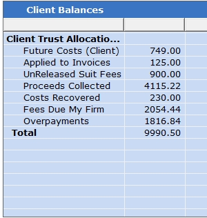 button to display the Client Balance Section. Depending on the Accounting Configuration of the Client, these balances may reflect totals for all accounts attached to this client or only balances for the selected claim and these balance maybe adjusted from the account level or client level.
