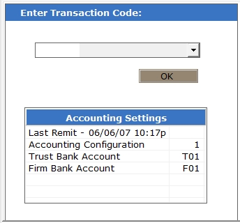 In this section, you can chose the transaction code to be entered on this claim. See Enter Financial Transactions .This section also lists some Accounting settings including the Last Remittance date, Accounting Configuration, Trust and Firm Bank.