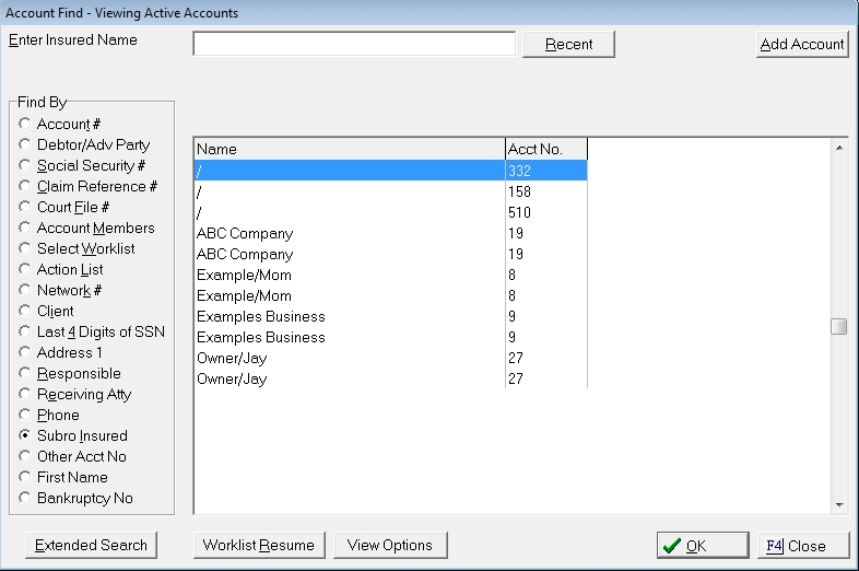 CollectMax allows users to find debtor accounts by the Insured's Name. Insured Names are a feature of the Subrogation Module.