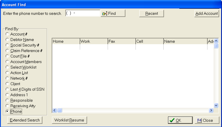 This feature allows user to find debtor accounts by entering a complete phone number.