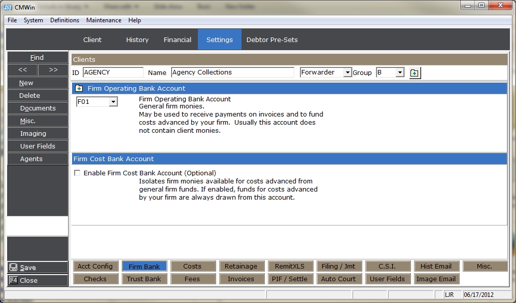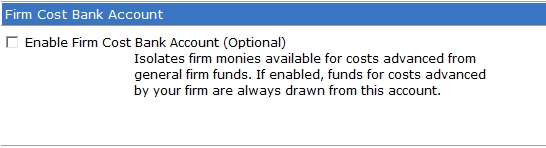 To isolate firm money for costs advanced from general firm funds, you can mark the box labeled Enable Firm Costs Bank Account.