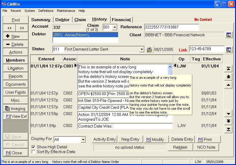 On the history screen of a debtor's account, move the pointer over the history entry to be viewed. A history hint will pop-up with the complete history entry.