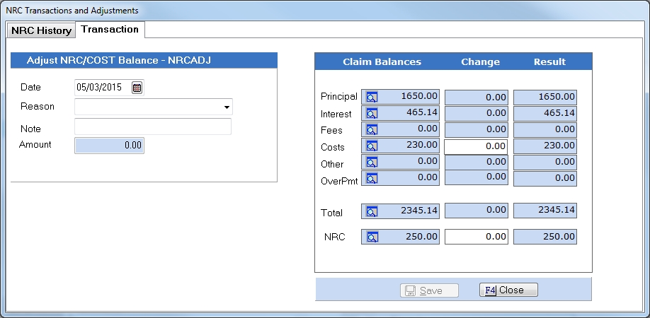 button to display the NRC Transactions and Adjustments Screen. If you do not a NRC balance this button will not be displayed.