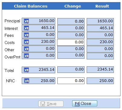Review the Judgment Amounts, Current Balance Amounts and Adjustments to insure the claim balance will be accurate post judgment. If something seems inaccurate, click the button and adjust the cost and payment posting or click