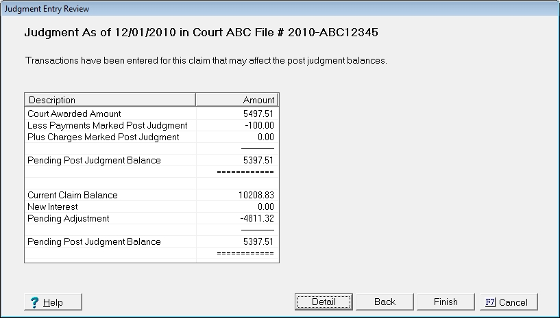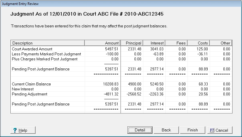 The details list the balances and adjustments to balances for each balance component. The Pending Post Judgment Balance will be the claim balance once the judgment is posted.