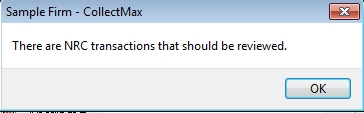 If you fail to review the NRC screen before saving, a reminder message will be displayed. Click the button to display the NRC Transactions and Adjustments Screen.
