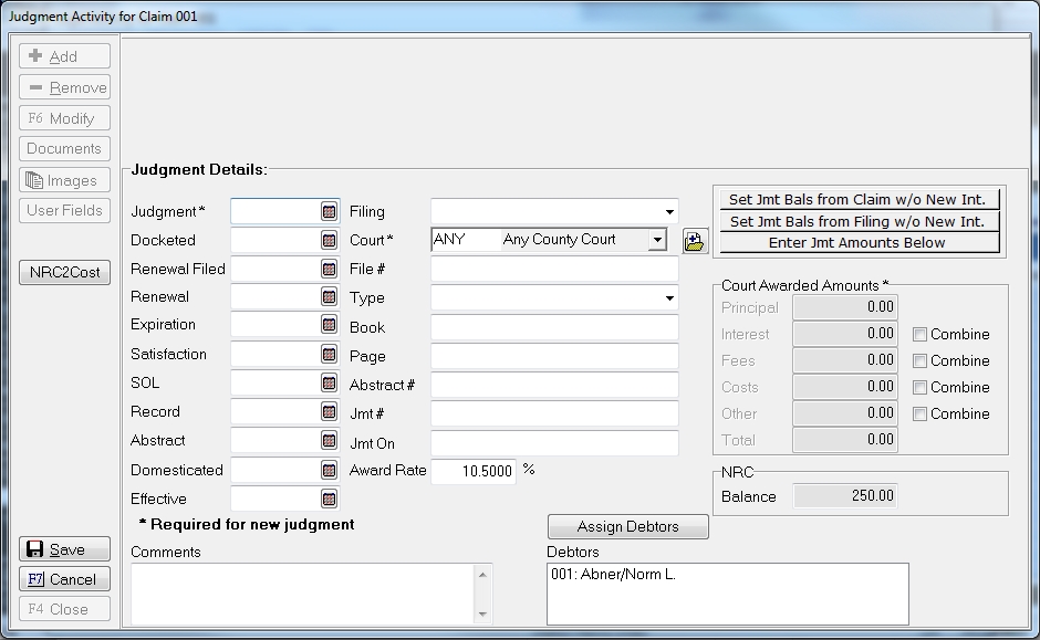 Note: Attaching a Filing allows the filing balances to be pulled in as the Judgment Balance. However, no filing is required to be attached to the filing.