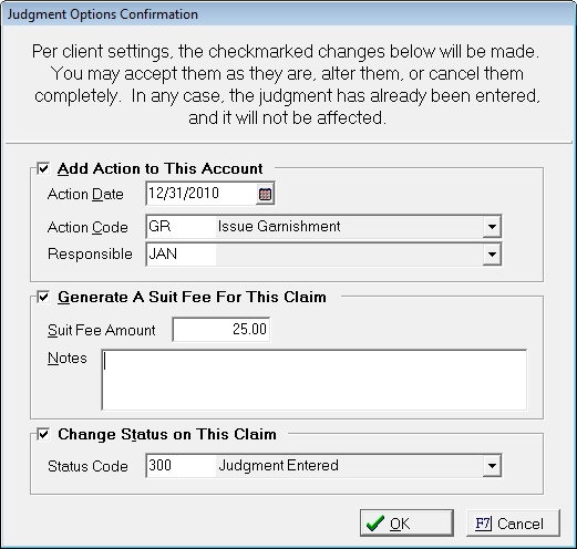 46. If Judgment Option have been set for this client, the Judgment Options Confirmation Screen will be displayed.