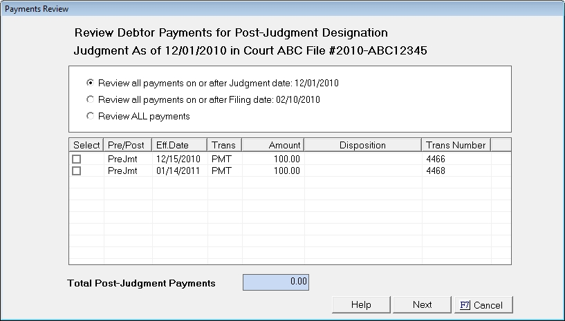 Click the box next to the payments that should be recorded post judgment. Moving payments to post judgment adjusts the post judgment claim balance to exclude the selected payments amounts.