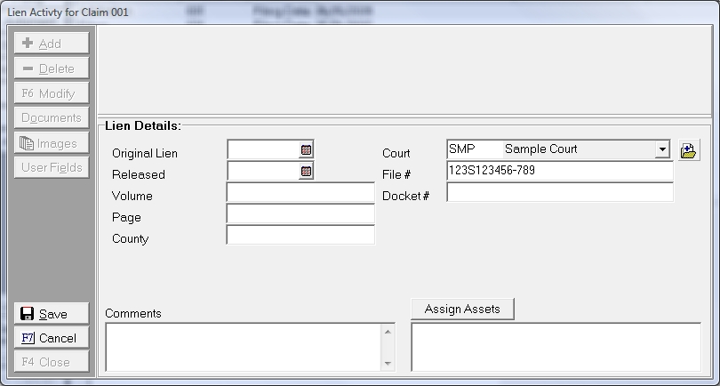 Note: Selecting the proper claim before entering the lien is essential. The proper claim cannot be selected from the Litigation Screen and once a lien is entered, you cannot move the filing to another claim without deleting and re-enter it.