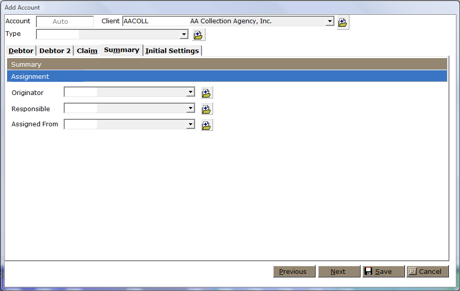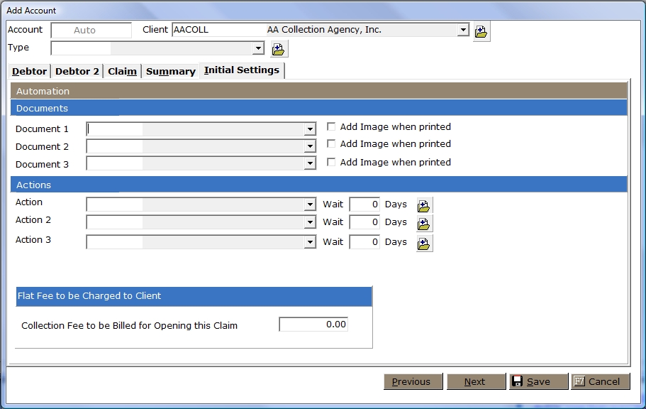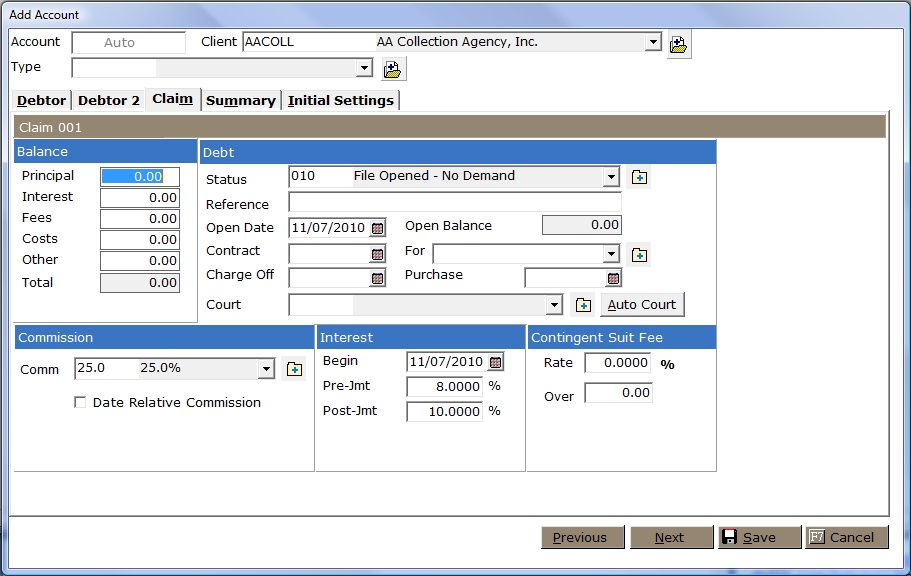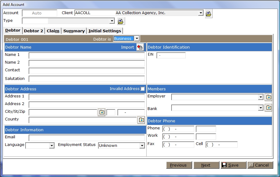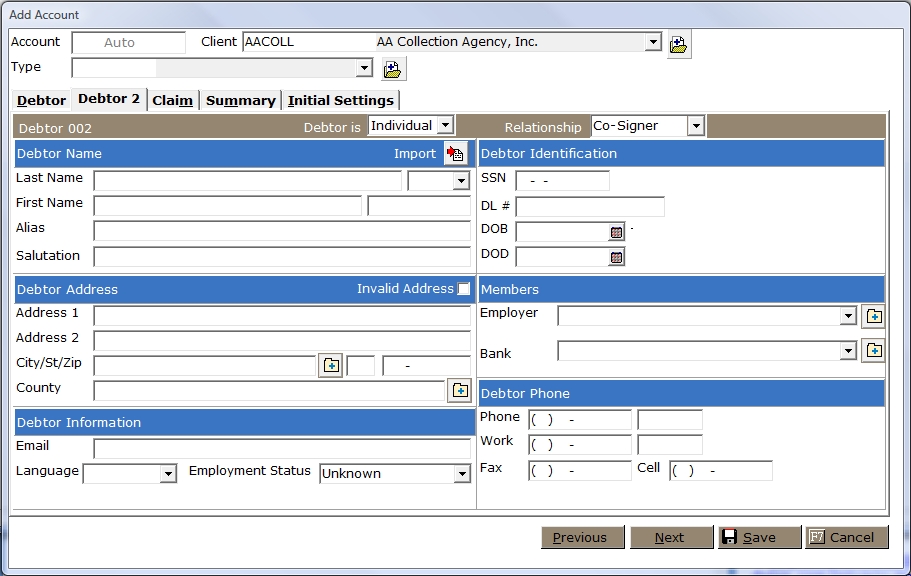 The Add Account Screen consists of 4 tabs: Debtor, Debtor 2, Claim, Summary and Initial Settings. Begin by completing fields of information on the Debtor Tab. Subrogation Users will also see a Subrogation Tab.