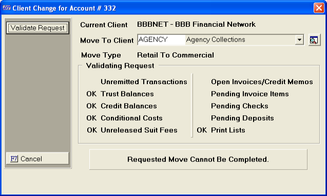 An OK will be shown in front of any item that meets the criteria. If any of the criteria is not met, the account can not be moved to the new client. Users must delete, remit or post the pending items.