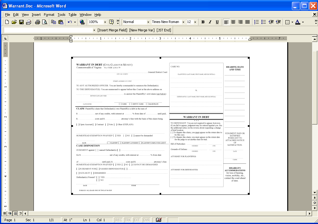 A fully printed court form will print the court form as well as the merge fields. Typically, the form is scanned and saved as a bitmap (.bmp) image or sometimes the form is available from the court in portable document format (.pdf). Please contact the courts in your area to check availability. PDF images must be converted to a bitmap image by using the Adobe Acrobat program. If using a scanner, scan the court form and save as a bitmap.