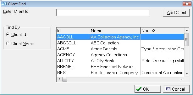 Single clients are selected by client ID or by name. The Client Find Screen will appear on your screen: