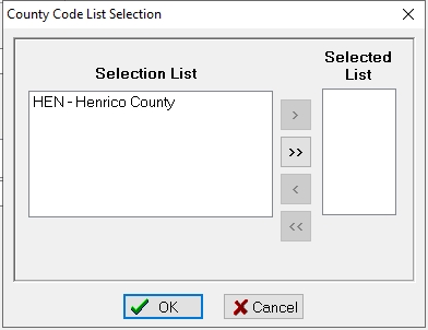 Select the code in the selection and click the right arrow to moved them to the Selected List until all required county codes have been selected. Click OK to continue. Use the double arrows to move all codes to or from the selected list and the left arrow to remove them from the list.