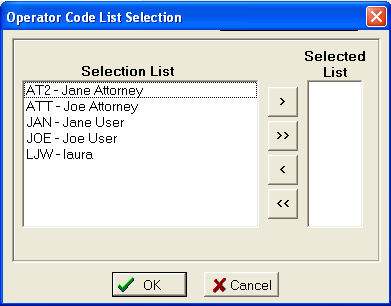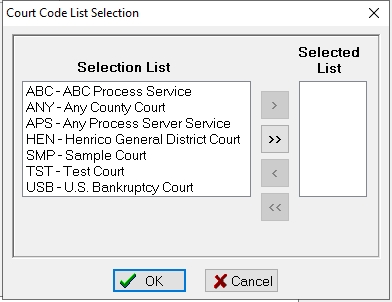 Select the code in the selection and click the right arrow to moved them to the Selected List until all required Courts have been selected. Click OK to continue. Use the double arrows to move all codes to or from the selected list and the left arrow to remove them from the list.