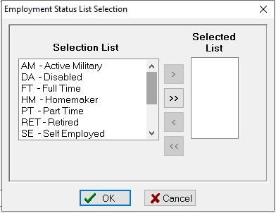 Select the code in the selection and click the right arrow to moved them to the Selected List until all required employment statuses have been selected. Click OK to continue. Use the double arrows to move all codes to or from the selected list and the left arrow to remove them from the list.